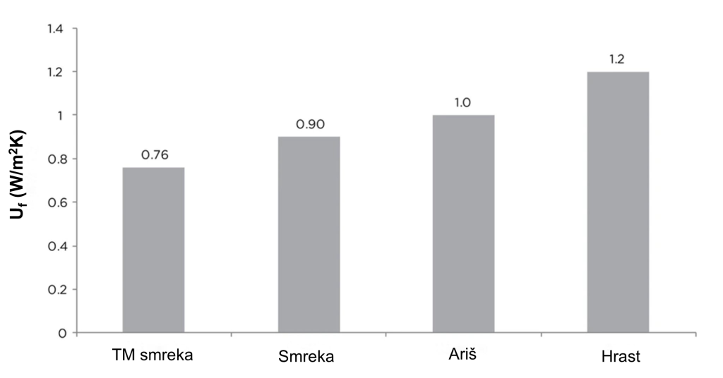 Vrste se drva razlikuju, između ostalog, u smislu toplinske provodljivosti (λ) koja u osnovi ovisi o gustoći drva, kao i o vlažnosti drva. λ drva povećava se u povećanju gustoće drva pri istoj vlažnosti drva. λ smreke je 0,11 W/mK, ariša 0,13 W/mK, merantija 0,15 W/mK i hrasta 0,18 W/mK. Toplinski modificirana (TM) smreka ima vrlo dobru vrijednost λ od 0,09 W/mK. Tako se i Uf mijenja uporabom različitih vrsta kao što je prikazano na donjem grafikonu gdje se koristi primjer prozorskog profila debljine 92 mm i s izolacijskim zračnim komorama (Natura E92).