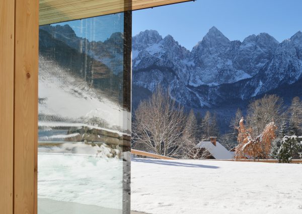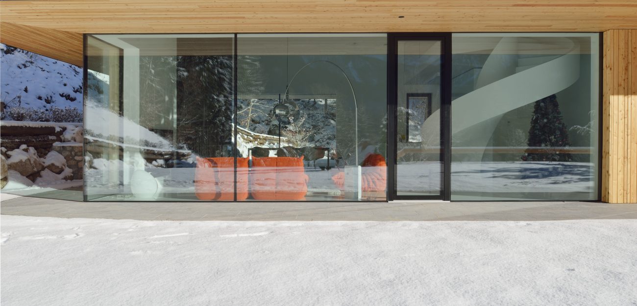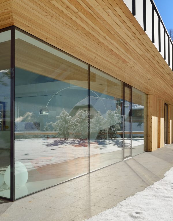 Okno za sodobno arhitekturo s stekleno zunanjostjo: les je skrit za izolacijskim steklom z emajliranim robom, zato fasada deluje minimalistično in čisto. V notranjosti ostane topel, natančno obdelan les. Rešitev zagotavlja visoko zrakotesnost in stabilnost tudi pri večjih formatih – diskreten, a izrazit arhitekturni element.
