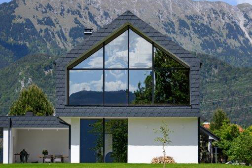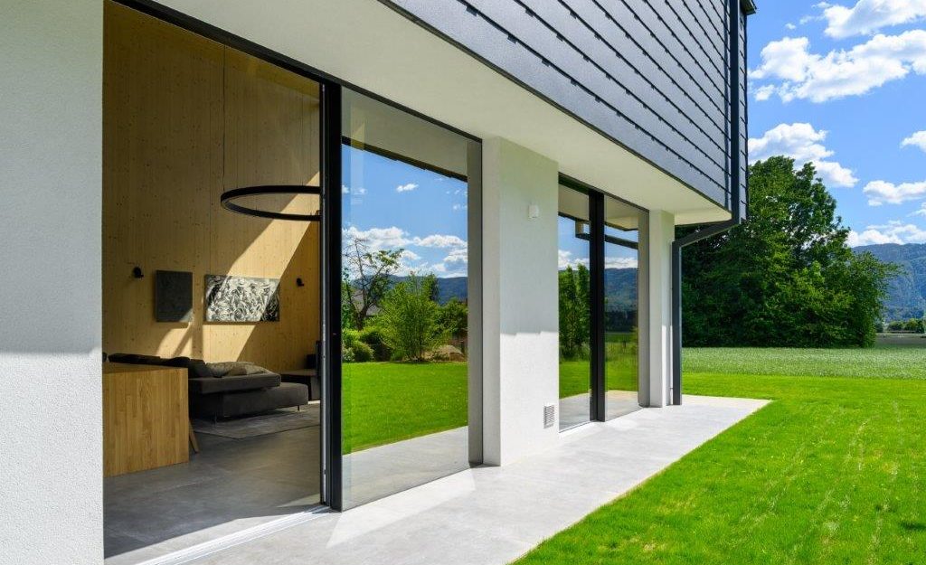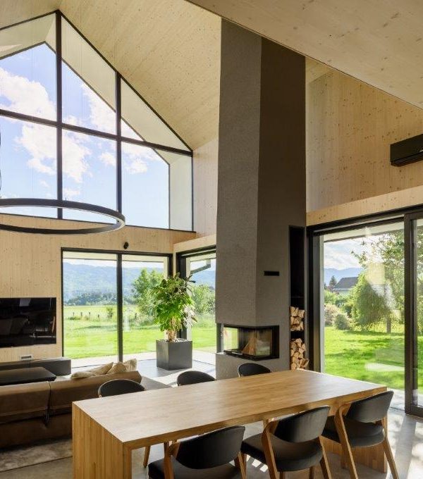 Okno za sodobno arhitekturo s stekleno zunanjostjo: les je skrit za izolacijskim steklom z emajliranim robom, zato fasada deluje minimalistično in čisto. V notranjosti ostane topel, natančno obdelan les. Rešitev zagotavlja visoko zrakotesnost in stabilnost tudi pri večjih formatih – diskreten, a izrazit arhitekturni element.