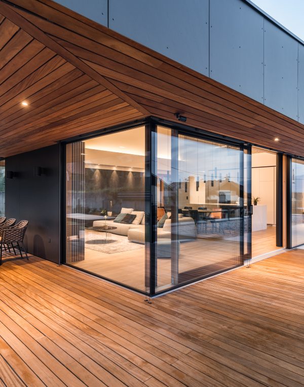 Okno za sodobno arhitekturo s stekleno zunanjostjo: les je skrit za izolacijskim steklom z emajliranim robom, zato fasada deluje minimalistično in čisto. V notranjosti ostane topel, natančno obdelan les. Rešitev zagotavlja visoko zrakotesnost in stabilnost tudi pri večjih formatih – diskreten, a izrazit arhitekturni element.