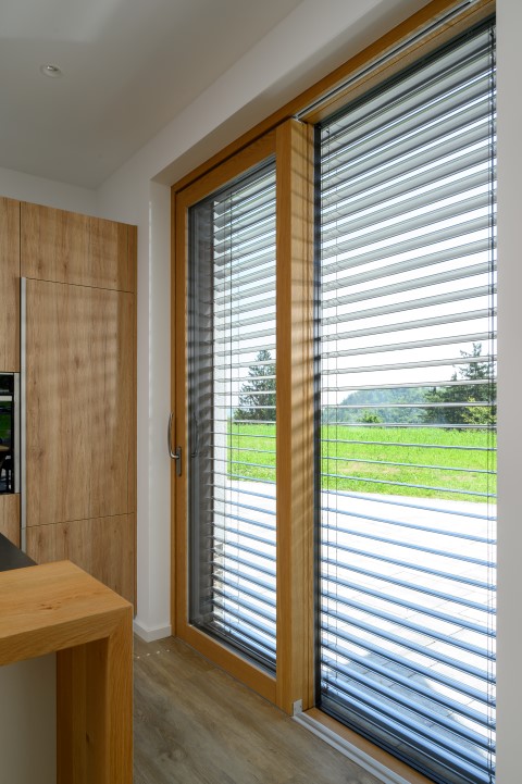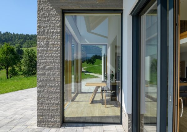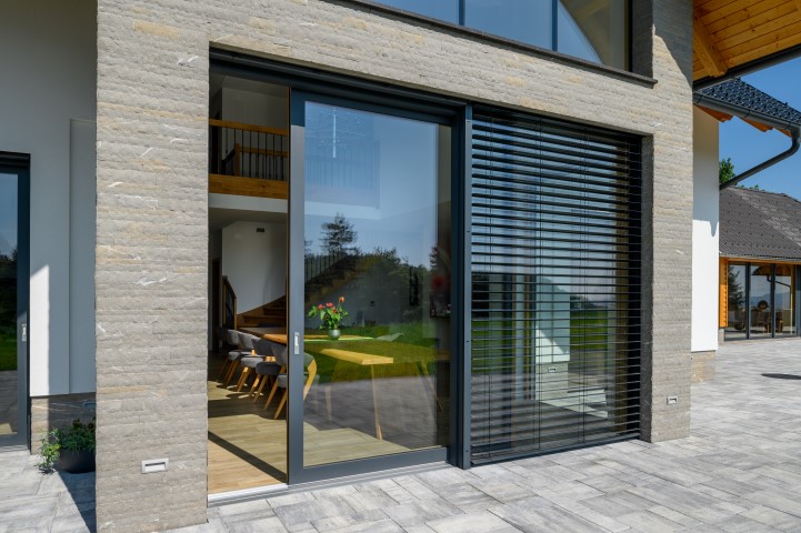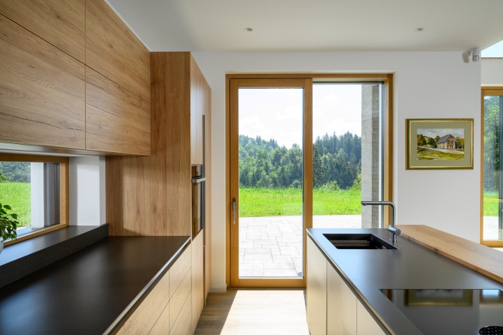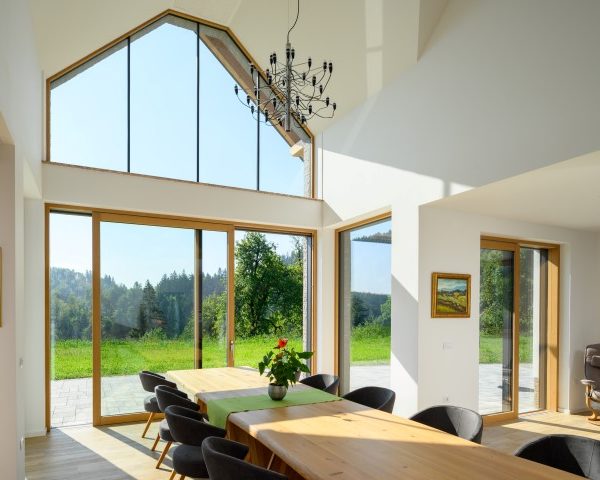 S jedne strane vlasnici su željeli arhitekturu što više približiti arhitektonskoj tradiciji okolnog područja, a s druge strane je otvoriti jedinstvenim pogledima na okolne livade i šume. Prekrasan pogled kroz velike ostakljene i klizne panoramske stijene. Okviri prozora od hrastovine vidljivi su s unutarnje strane i lijepo uokviruju zelene nijanse prirode, a s vanjske su strane zaštićeni od vremenskih utjecaja aluminijem u antracit boji koje se povezuje s odabranim krovnim pokrovom. (Foto: Miran Kambič)