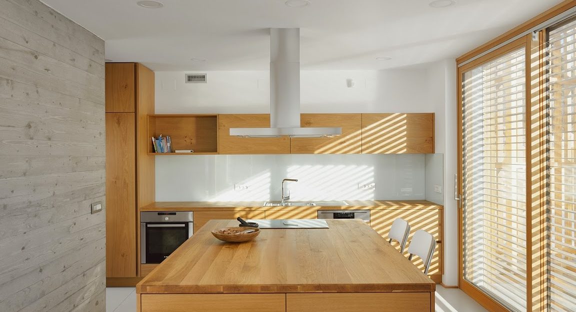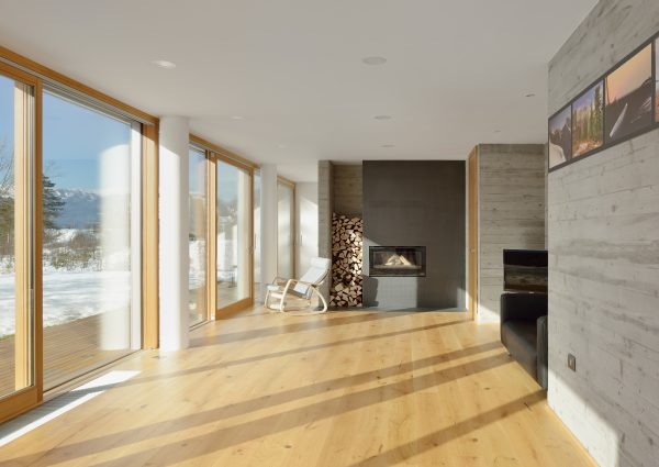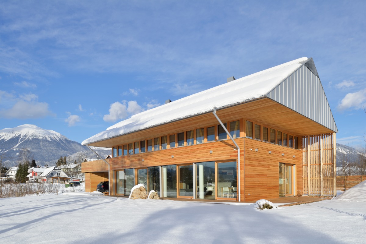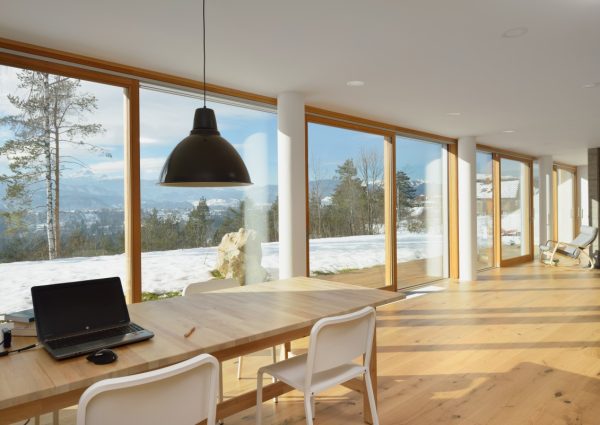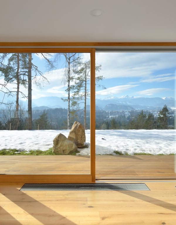 Kuća L nalazi se na rubu naselja gdje se s jedne strane pruža prekrasan pogled na Julijske Alpe i Bled. Objekt je prozorima i panoramskim stijenama okrenut prema vrtu i planinskoj panorami u pozadini, a prema ulici se zatvara čime stanovnike štiti od buke. Prilikom projektiranja interijera promišljeno su kombinirali beton, staklo i drvo kako bi stvorili suvremen i otvoren prostor u kojem se osjeća dom. (Foto: Miran Kambič)